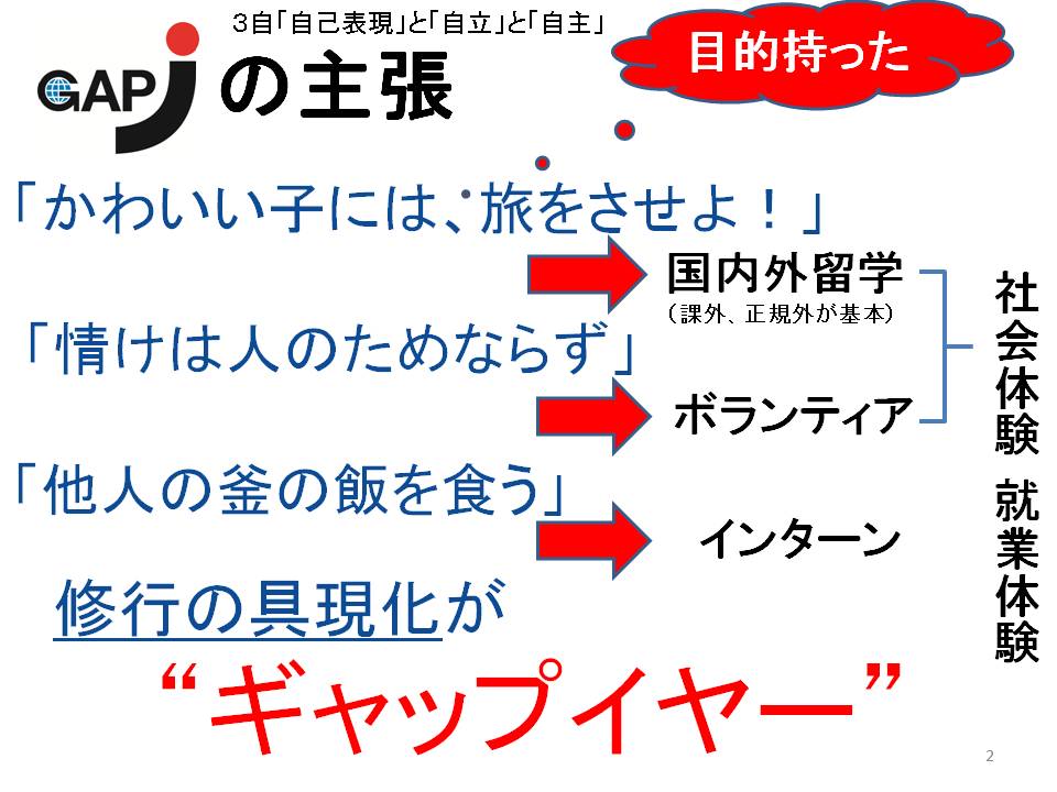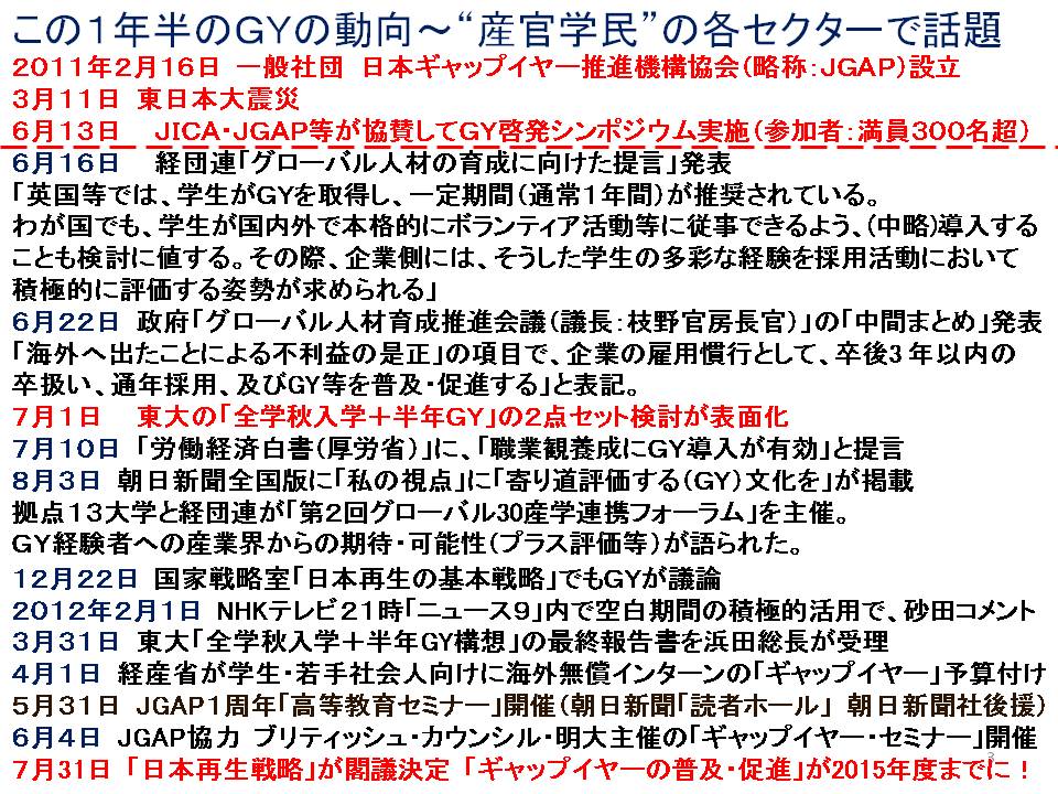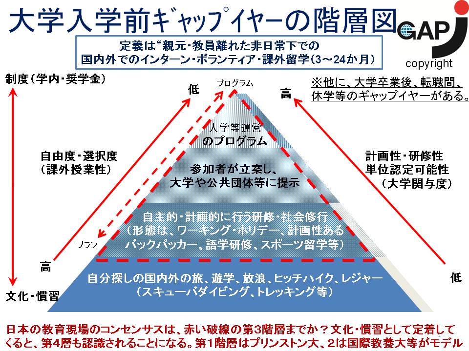 5人のメンバーとJGAPの関連性は、公式ウェブの人気エッセイ欄「フロンティア・フォーラム」に時期が違うがそれぞれ寄稿していること。JGAP砂田 薫代表は、ギャップイヤーの日本での状況とCIRCUSの5人のポジショニングについて考察し、以下のスライドを使いながら、その期待を述べた。
