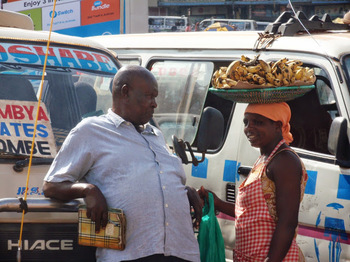 アフリカらしい光景です。ウガンダはバナナがたくさん売っている。右側、男性かと思っていたけど女性みたいですね。