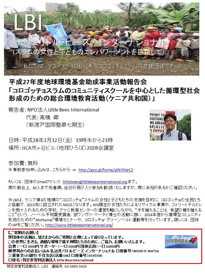 平成27年度地球環境基金助成事業活動報告会を(2月12日(金)19:30から開催します!(高橋 郷)![]()